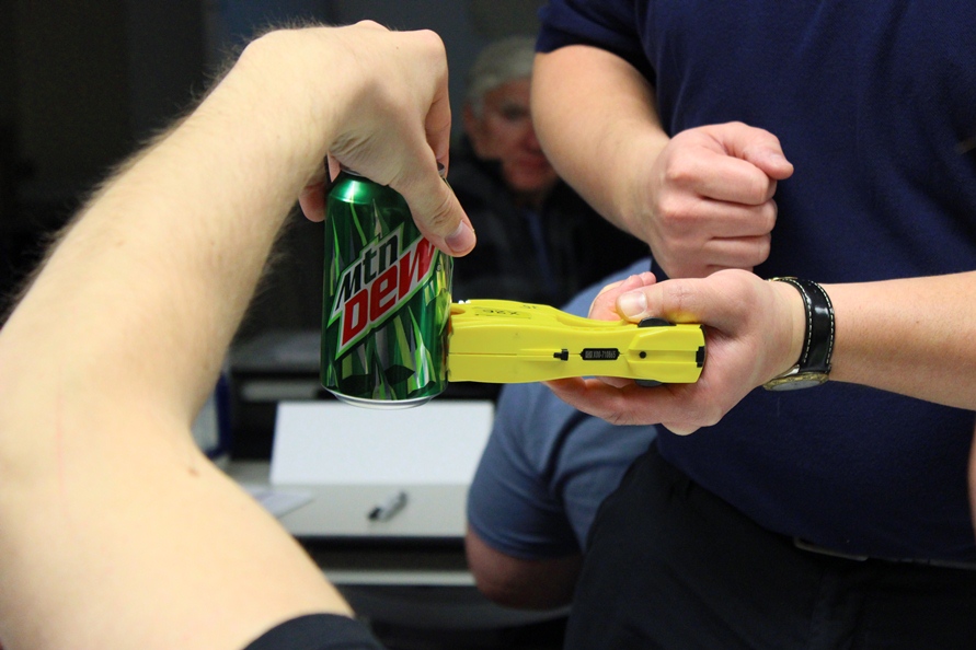 Officer Rindfleisch demonstrating how the CEW electric charge stays between the two probes.