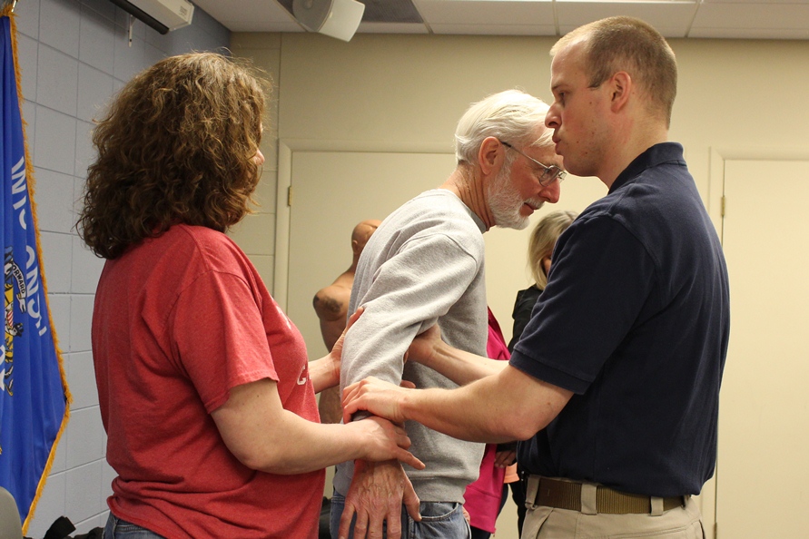 CPA participants Rhonda Rayburn and Jerome Jiracek learning proper escort techniques from Lt. Dan Kloss.