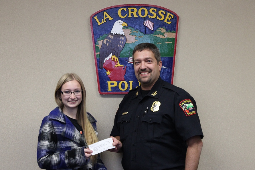 Krystal Burrows presenting her donation to Chief Ron Tischer.