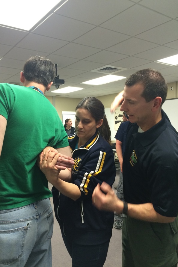Lisa learns from Lt. Troy Nedegaard the proper technique for applying the rear compliance hold on Russell.
