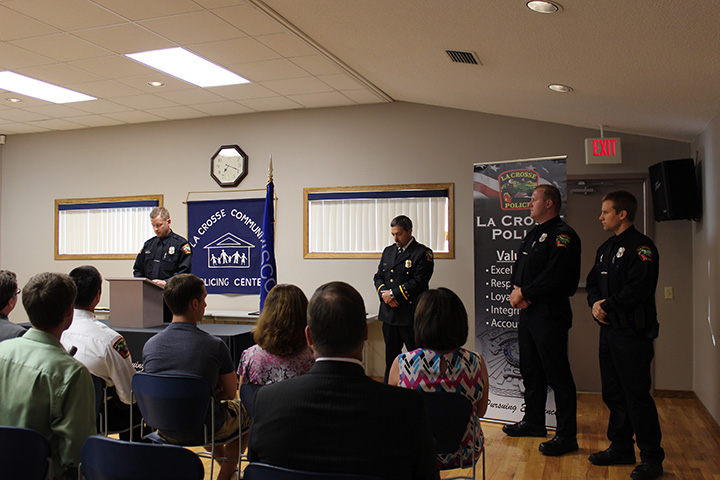 Investigator Tony DeLap reads out the awards for Officer Steve Hughes and Officer Justin Eddy