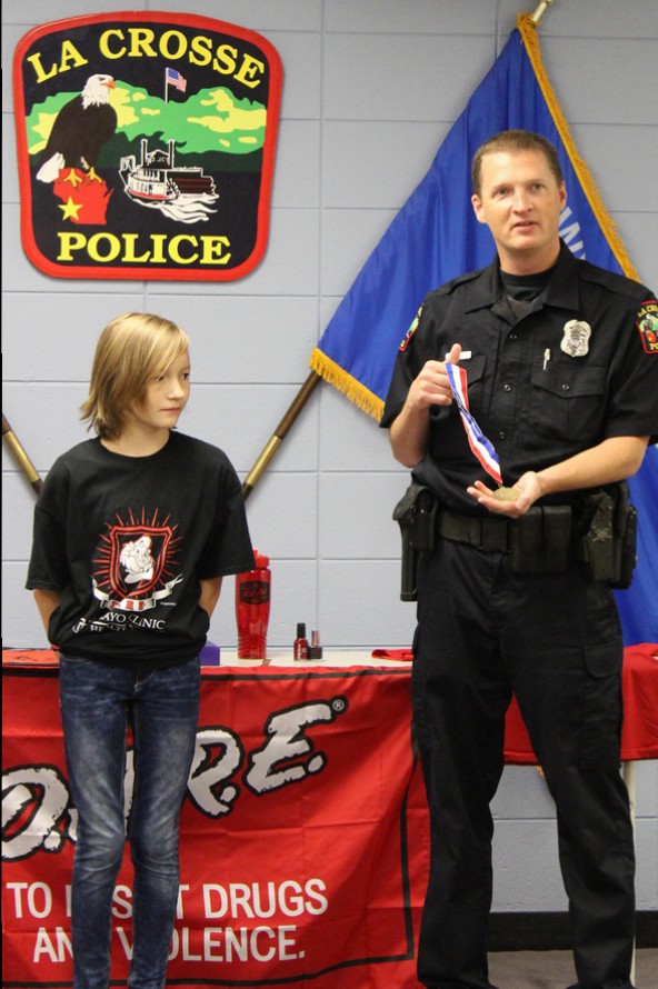 DARE Officer Kurt Weaver presenting Anika Nystrom with Essay Winner medal.