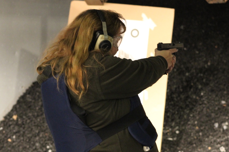 Patty Rhodes practicing safe handling of the Glock.
